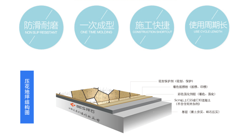 实际上压花地坪增强材料是按照一定比例的某种金属和非金属骨料形成的,所以更耐用耐磨。另外压花地坪的宏基混凝土封闭保护剂具有一定的耐酸碱等特殊性能,比普通路面更便于清洗。